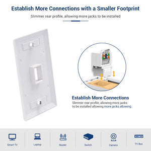 - 유연한 사용: 다양한 표면 실장 박스 및 벽면 플레이트에 적합합니다. 하나의 플레이트에 여러 개의 키스톤을 통합하는 데 이상적입니다. 참고: 패치 패널과 호환되지 않습니다.