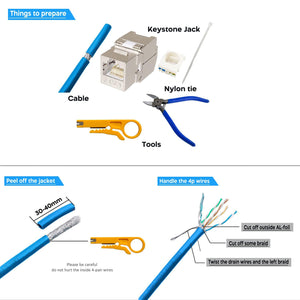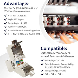 - Tool-Free Termination: 180° keystone jack allows for easy, tool-free termination. Compatible with T568-A/T568-B standards and supports 110 or Krone tools for versatile installation