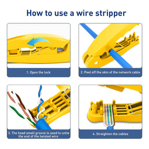 Unlock tool, peel cable skin, untie wires using the small groove, then straighten cables for optimal connection.