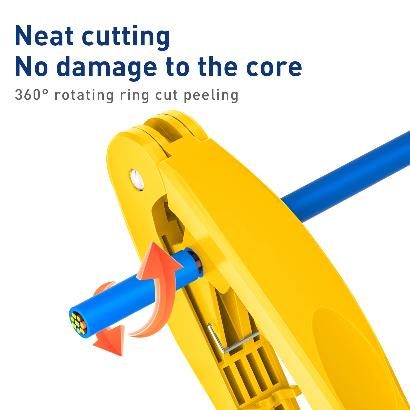 Neatly cuts without damaging the cable core, thanks to a 360° rotating ring for stripping.