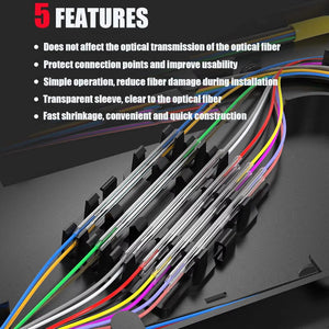 【Protect Fiber Fusion Points】Clear sleeve makes it easy to detect splices before shrinkage, The fiber optic heat shrink tubes are tight and the metal support maintains its strength to prevent the fiber from breaking at the splice. Smooth deburred stainless steel reinforcing member ends to decrease the risk of fiber damage during installation.