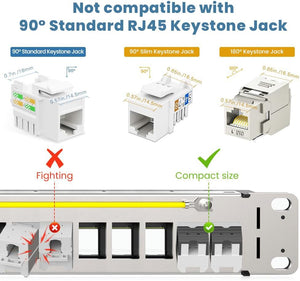 - Совместимость с Keystone: поддерживает разъёмы Keystone RJ45 с углом поворота 180° и 90° (шириной 1,6 см). Примечание: не подходит для стандартных разъёмов Keystone с углом поворота 90° шириной 1,8 см, что гарантирует идеальную совместимость с разъёмами Keystone определённых типов.
