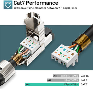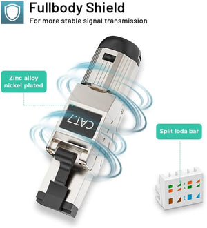 - 【Цельнометаллическая оболочка】Полностью металлическая оболочка RJ45-вилка для полевых работ, предназначенная для кабельных сборок Cat 7, беспроводных точек доступа, а также сетевых коммутаторов и серверных подключений. Прочная металлическая альтернатива модульным вилкам RJ45.