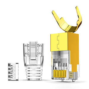 - 【Материал и характеристики】Концевые наконечники Cat 7 оснащены лезвиями из чистой никелированной меди с 50-микронным золотым покрытием, обладающими антиокислительной защитой, высокой устойчивостью к старению и сверхнизким импедансом. Двухкомпонентная конструкция облегчает фиксацию положения сердечника сетевого кабеля при обжиме RJ45.