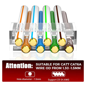 - 【Только совместимый】Этот разъём CAT7 RJ45 совместим как с многожильными, так и с одножильными кабелями STP/FTP CAT7/CAT6A. (Несовместим с версиями CAT6, CAT5e и CAT5). Поддерживает внутренний проводник 23 AWG и изоляцию с внешним диаметром 1,30–1,50 мм; внешний диаметр ДОЛЖЕН соответствовать требованиям. Внешний диаметр оболочки кабеля LAN составляет 7–8 мм. Для этого разъёма RJ45 сердечник кабеля CAT6, CAT5E или CAT5 слишком тонкий, что приводит к его проскальзыванию внутри нагрузочной планки, что затрудняет правильный обжим.