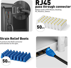 【Проходные разъемы RJ45】В комплект также входят 50 проходных разъемов Cat6 с 50 защитными колпачками, 1 мини-стриппер для кабеля и 2 запасных лезвия.