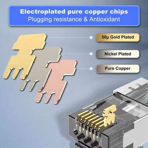 【Высокое качество гарантирует высокую производительность】 Этот разъём RJ45 CAT7 с позолоченными контактами толщиной 50 мкм и трёхконтактными контактами увеличивает площадь контакта и улучшает проводимость. Мы также используем более толстые и пропорциональные позолоченные контакты для обеспечения более надёжной и стабильной передачи данных. Материал корпуса — новый экологически чистый ПВХ, прочный, огнестойкий и устойчивый к изгибу. Модульный разъём Cat7/Cat6a поддерживает скорость передачи данных до 10 гигабит в секунду. Металлическая оболочка устраняет перекрёстные помехи и предотвращает электромагнитные помехи (EMI), обеспечивая более стабильное соединение.