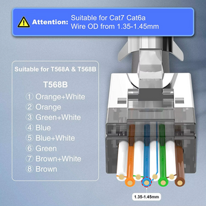 【Подходящий кабель Ethernet】 Этот разъем CAT6A RJ45 совместим как с многожильными, так и с одножильными кабелями STP/FTP CAT7/CAT6A. (Не совместим с версиями CAT8, CAT6, CAT5e и CAT5). Поддерживает внутренний проводник 23 AWG и изоляцию с внешним диаметром 1,35–1,45 мм; внешний диаметр ДОЛЖЕН соответствовать требованиям. Внешний диаметр оболочки кабеля LAN составляет 7–8 мм. Для этого разъема RJ45 сердечник провода CAT6 CAT5E CAT5 слишком тонкий, что приведет к скольжению сердечника внутри нагрузочной планки, что сделает невозможным правильный обжим. Сердечник провода кабеля CAT8 слишком толстый, из-за чего сердечники невозможно будет вставить в нагрузочную планку, что приведет к увеличению трудностей при установке.
