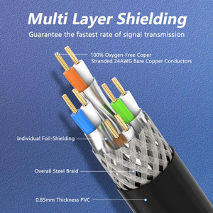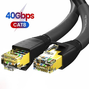 Прочность и стабильность: кабель CAT8 Rj45 изготовлен из 100% бескислородной меди, состоит из 4 пар 100% чистой и толстой экранированной витой пары (STP) 24WAG из медных проводов с разъемами Rj45, STP внутри изготовлен из нового защитного материала для защиты окружающей среды и по новейшим технологиям, кабель быстрее, тоньше, стабильнее и долговечнее, чем CAT7.