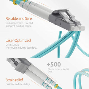 Этот оптоволоконный патч-корд LC-LC OM3 имеет оболочку цвета морской волны диаметром 3 мм. Кабели OM3 имеют полосу пропускания 1500 МГц·км и максимальное затухание 2,3 дБ/км при длине волны 850 нм. Они также имеют полосу пропускания 500 МГц·км и максимальное затухание 0,6 дБ/км при длине волны 1300 нм.