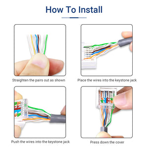 Для подключения этого разъема Cat6 Keystone не требуются инструменты. Все, что вам нужно сделать, это, возможно, приподнять часть оболочки вашего кабеля Ethernet, чтобы оголить провода внутри.